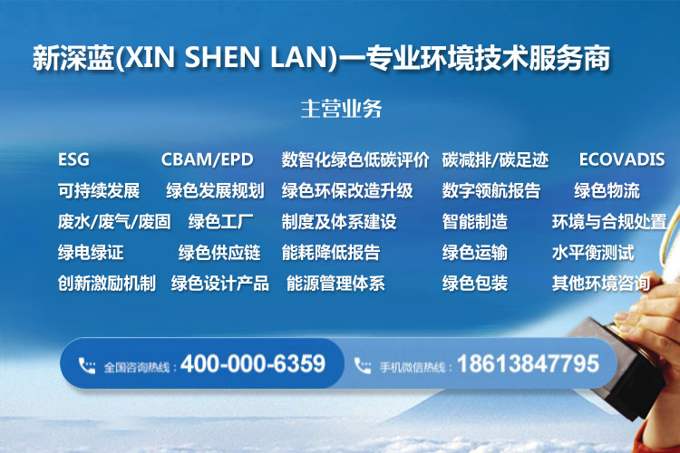 答:新深蓝环境科技(深圳)有限公司(简称新深蓝)是一家全国范围专业ESG服务商、国网南网加分报告服务商,主营ESG、碳中和、数智化、绿色低碳相关技术服务,主要包括ESG报告、ESG评级、ESG规划、ESG绩效提升、碳中和、碳足迹、碳核查、能源管理体系、绿色发展规划、废水/废气/废固、环评/能评、绿色电力证书、创新激励机制、创新成果评价、科研经费占比、企业绿码、绿色工厂、绿色供应链、数智化绿色低碳、数字化车间、数字领航企业、未来工程、智能工厂、智能制造示范工厂、智能制造优秀场景、卓越级智能工厂、绿色包装、绿色运输、绿色物流、绿色回收、绿色制造、应急保供、供应链保障、碳减排、CBAM报告(欧盟)、EPD、LCA报告、社会责任报告CSR、其他环境咨询、绿色低碳检测认证等相关技术服务。。